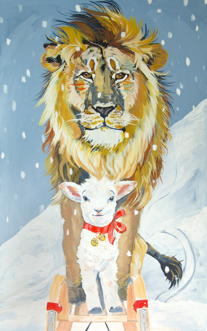 “Lion and Lamb,” originally painted in acrylic on a 30×48 inch canvas; now available as 5×7 cards or 11×17 prints on my shop.
